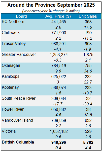 The British Columbia Real Estate Association (BCREA) reports that 5,782 residential unit sales were recorded in Multiple Listing Service® (MLS®) Systems in September 2025, up 4.4 per cent from September 2024. The average MLS® residential price in BC in September 2025 was up 0.4 per cent at $948,296 compared to $944,298 in September 2024.
