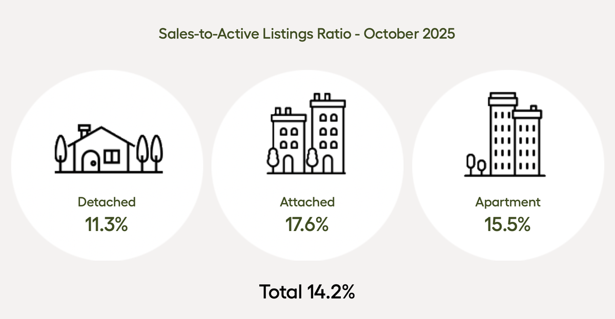 Across all detached, attached and apartment property types, the sales-to-active listings ratio for October 2025 is 14.2 per cent. By property type, the ratio is 11.3 per cent for detached homes, 17.6 per cent for attached, and 15.5 per cent for apartments. Analysis of the historical data suggests downward pressure on home prices occurs when the ratio dips below 12 per cent for a sustained period, while home prices often experience upward pressure when it surpasses 20 per cent over several months.