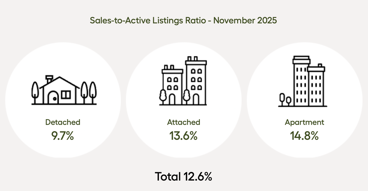 The total number of properties currently listed for sale on the MLS® system in Metro Vancouver is 15,149, a 14.4 per cent increase compared to November 2024 (13,245). This is 36.3 per cent above the 10-year seasonal average (11,116). Across all detached, attached and apartment property types, the sales-to-active listings ratio for November 2025 is 12.6 per cent. By property type, the ratio is 9.7 per cent for detached homes, 13.6 per cent for attached, and 14.8 per cent for apartments.