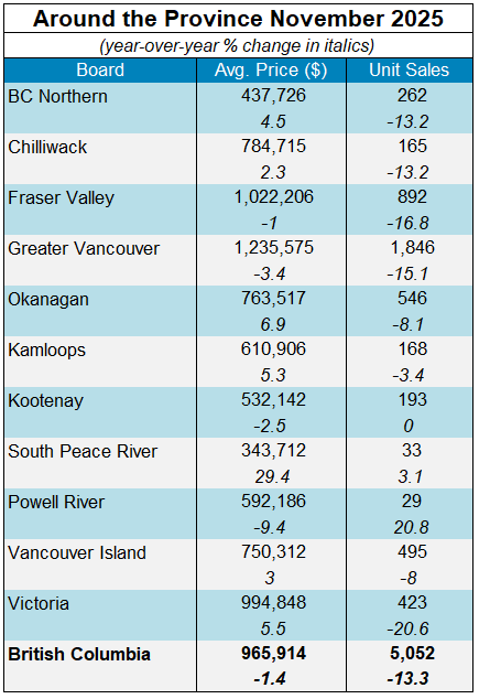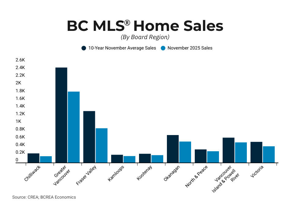 “Market activity cooled throughout the province in November, with sales in every region falling short of historical averages,” said BCREA Chief Economist Brendon Ogmundson. “While broader headwinds continue to linger, we hope stable rates and fading trade uncertainty with the US will stimulate sales moving into 2026.”Year-to-date, BC residential sales dollar volume is down 8.1 per cent to $62.9 billion, compared with the same period in 2024. Residential unit sales are down 5.6 per cent year-over-year at 65,997 units, while the average MLS® residential price is also down 2.7 per cent to $953,306.