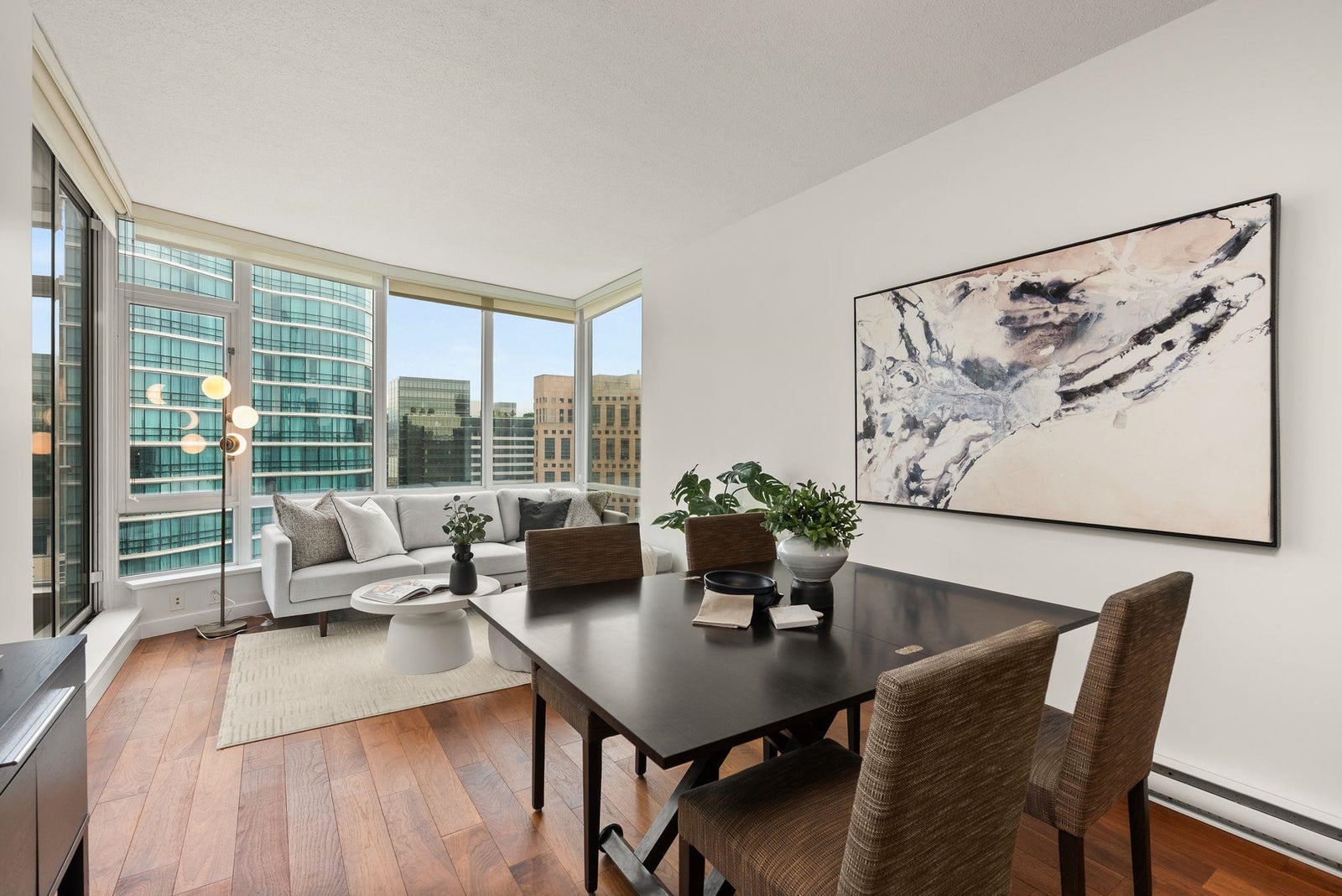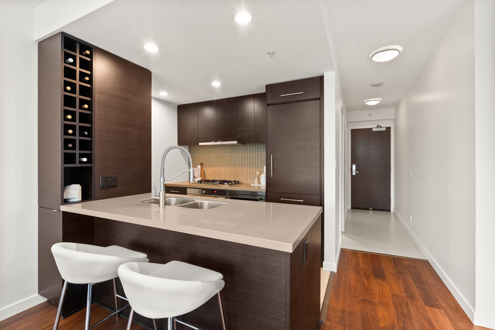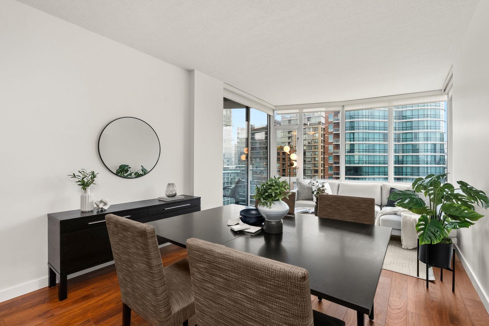 Immaculate 2 Bed+Den, 2 bath residence in one of Downtown Vancouver’s Entertainment District in a top-tier building: Atelier. With NE & NW exposure, enjoy sweeping city scape views amidst the backdrop of the North Shore mountains, iconic Library, BC Place & Metrotown. Hardwood floors flow seamlessly throughout the spacious living and dining areas & kitchen with quartz countertops, rich wenge cabinetry, and integrated paneled appliances—perfect for both everyday living and entertaining. Spacious bedrooms with incredible closet space. Building amenities incl CONCIERGE, gym, spin & yoga studio, rooftop/party room, bike storage, and parking. A rare opportunity to own a in the heart of Vancouver’s vibrant downtown - Walkscore 99! PARKING Incl OPEN HOUSE SAT Oct 11 @ 12-2pm